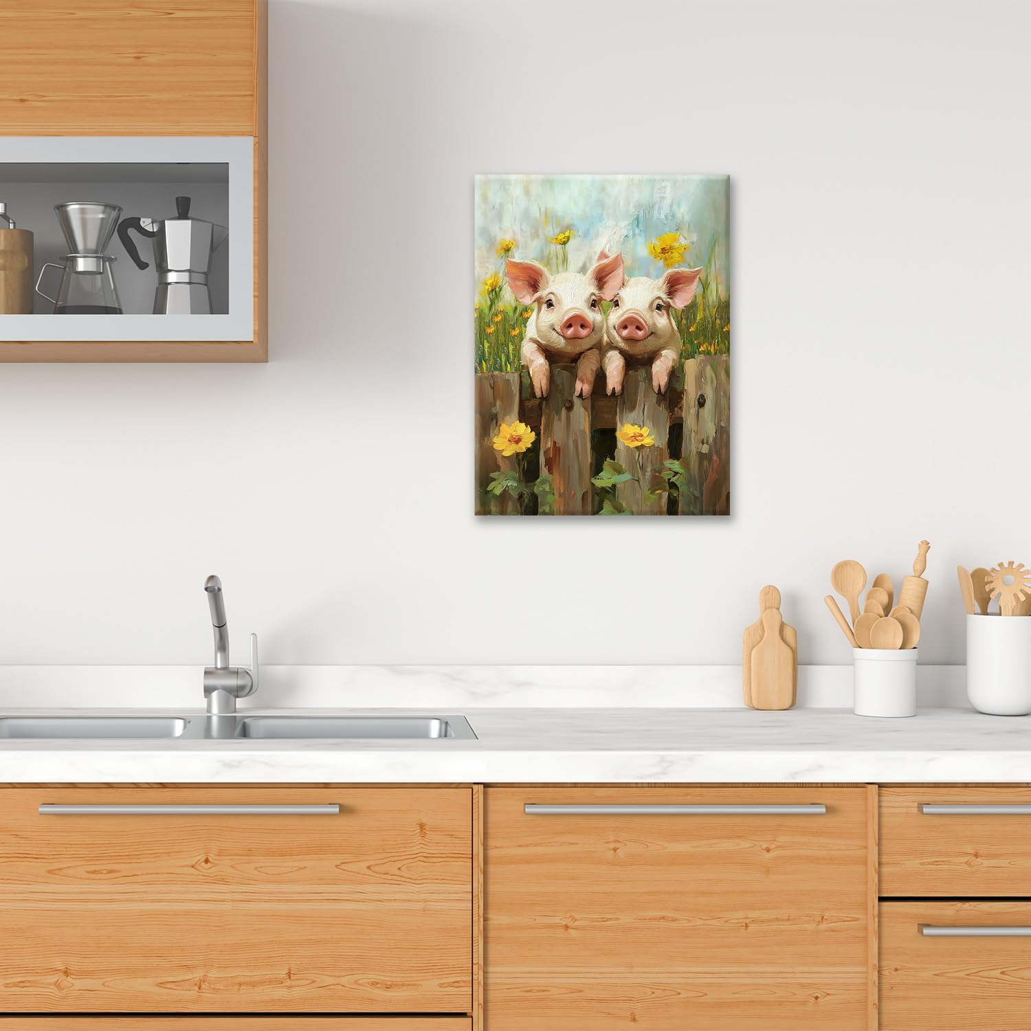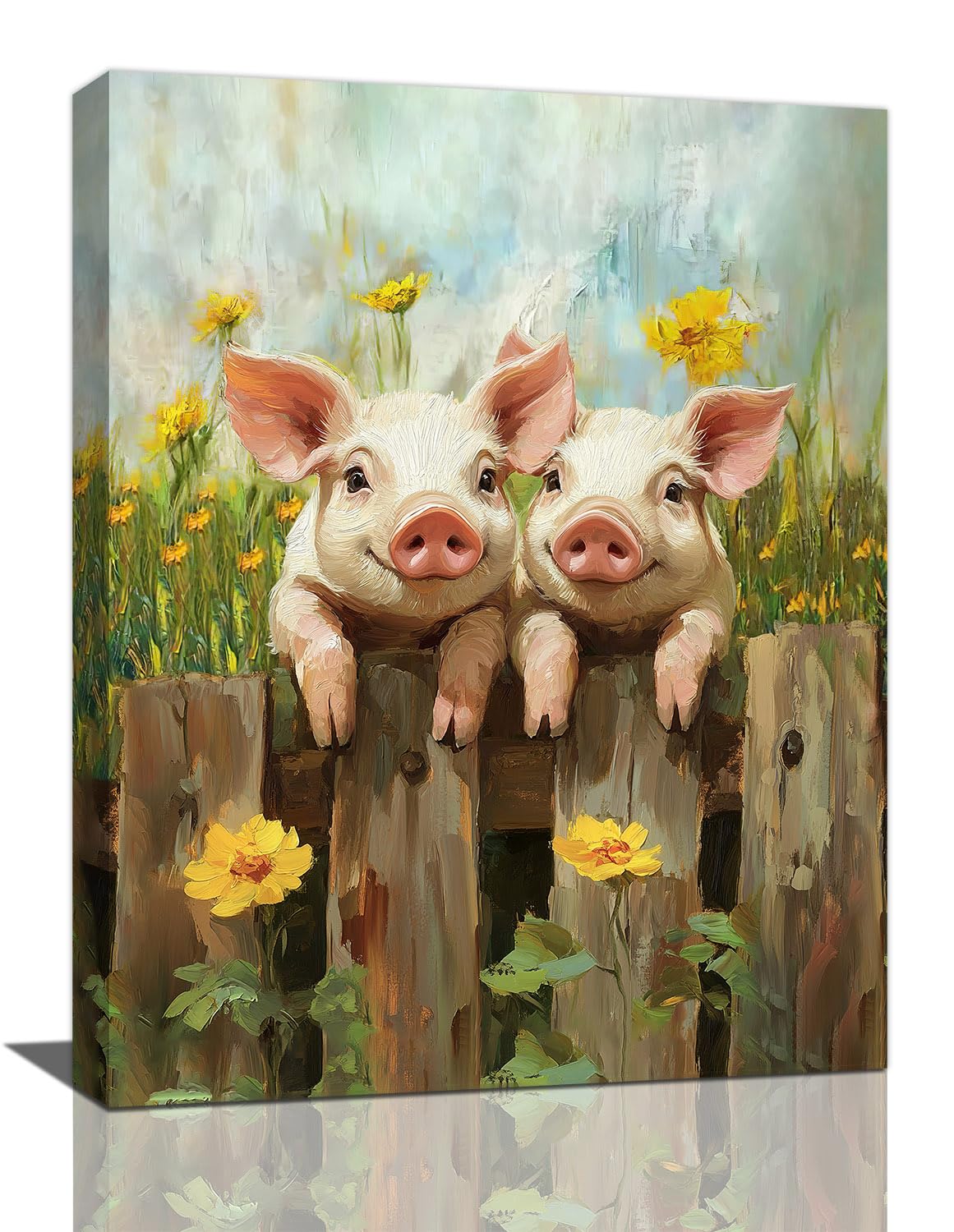 Farmhouse Pig Wall Art, Country Piggy Flower Pictures Wall Decor, Rustic Fence Animal Canvas Print Painting