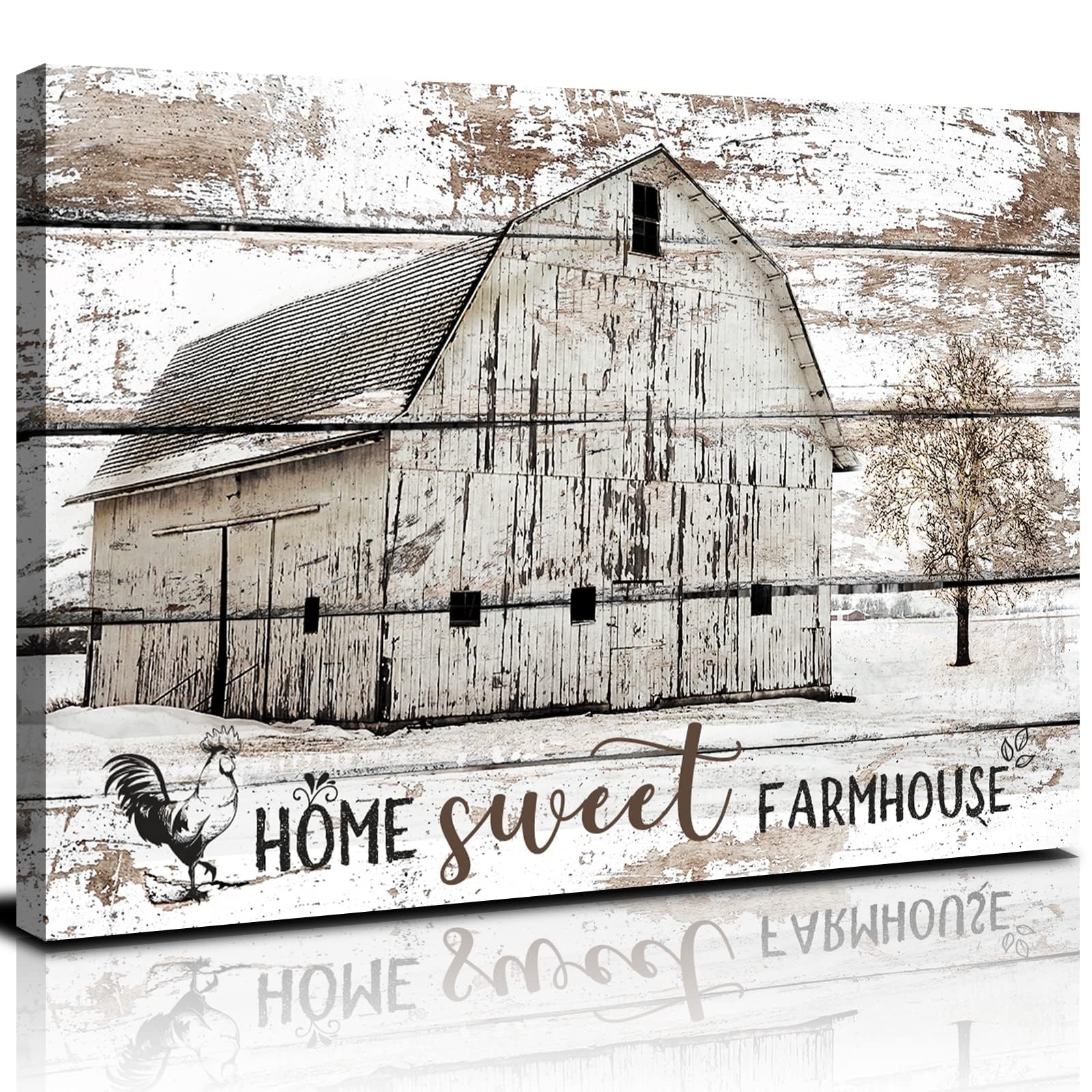 Barn Wall Art Farmhouse Pictures Wall Decor Rustic Barn Pictures Wall Art for Kitchen Living Room Cabin Home Decor Sweet Home Sign Poster Vintage Old White Barn Painting Artwork Decorations