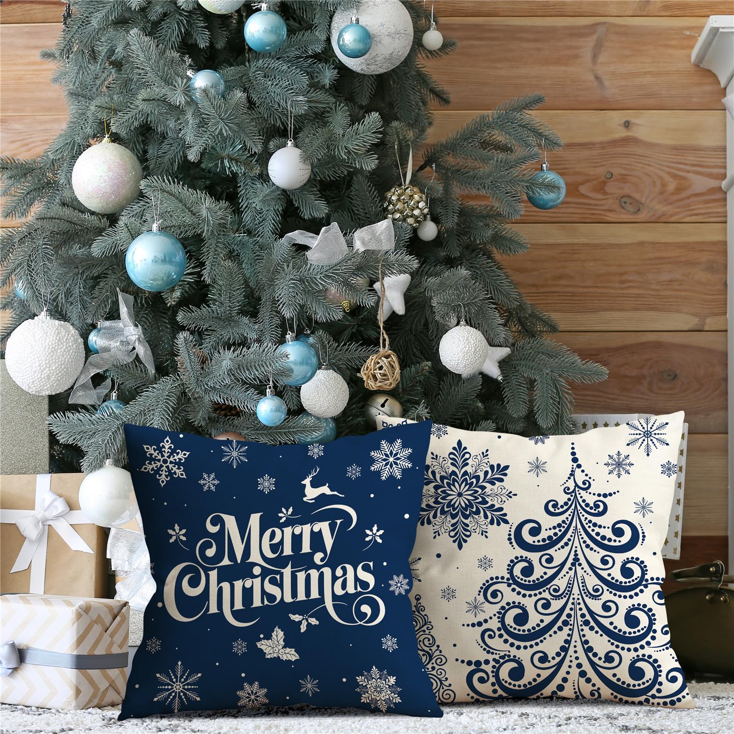 Christmas Pillow Covers 18x18 Blue Christmas Decorations Xmas Tree Snowflake Throw Pillow Covers Reindeer Winter Holiday Decor Cushion Case for Sofa Couch Set of 4