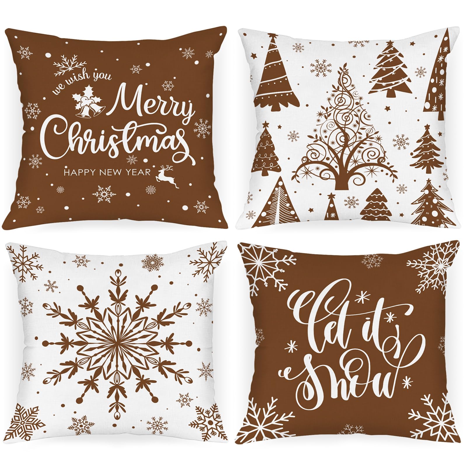 Christmas Throw Pillow Covers 18x18 Set of 4, Merry Christmas Winter Xmas Snowflake - Brown