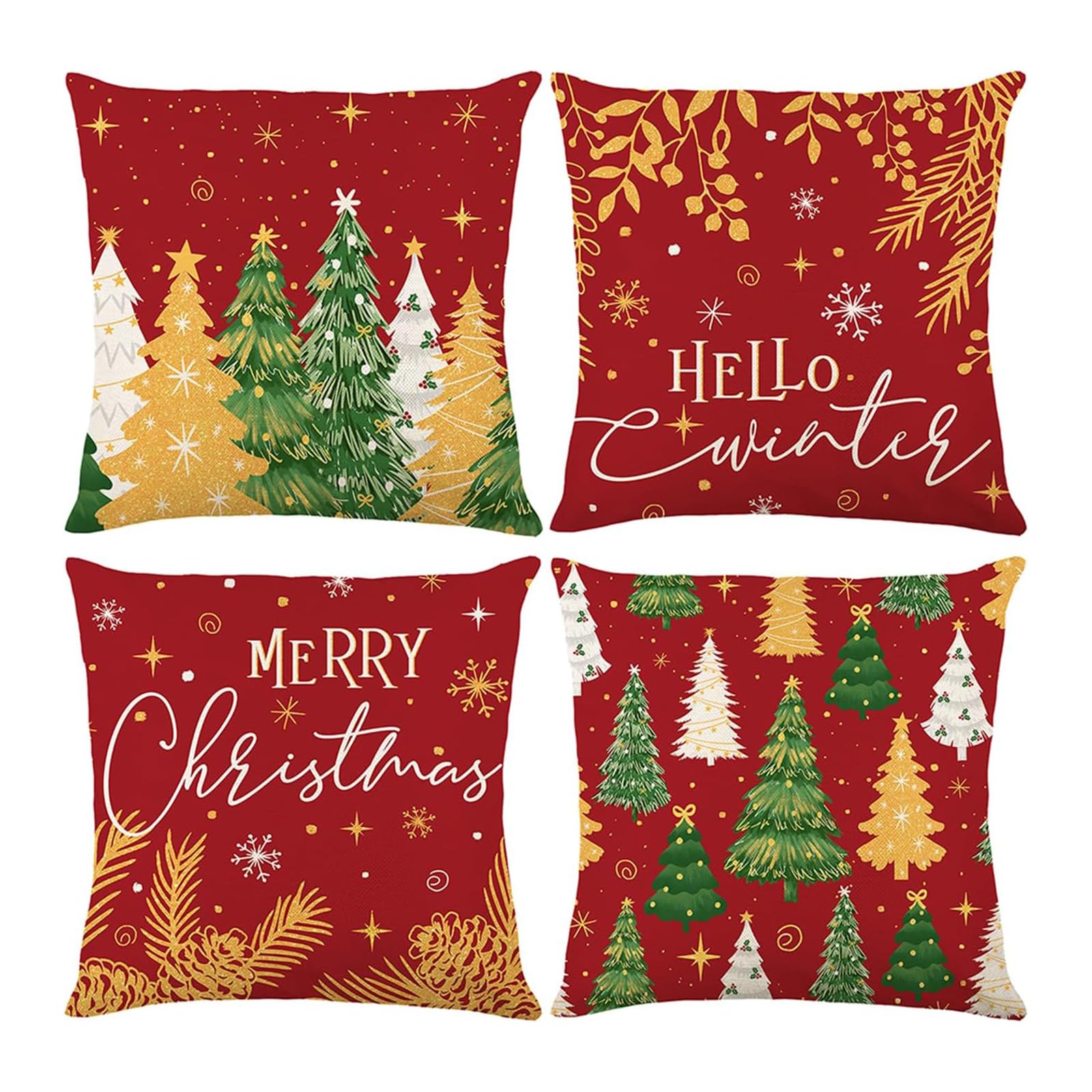 Merry Christmas Joy Xmas Trees Red Throw Pillow Covers, 18 x 18 Inch Christmas Winter Holiday Cushion Case Decoration for Sofa Couch Set of 4