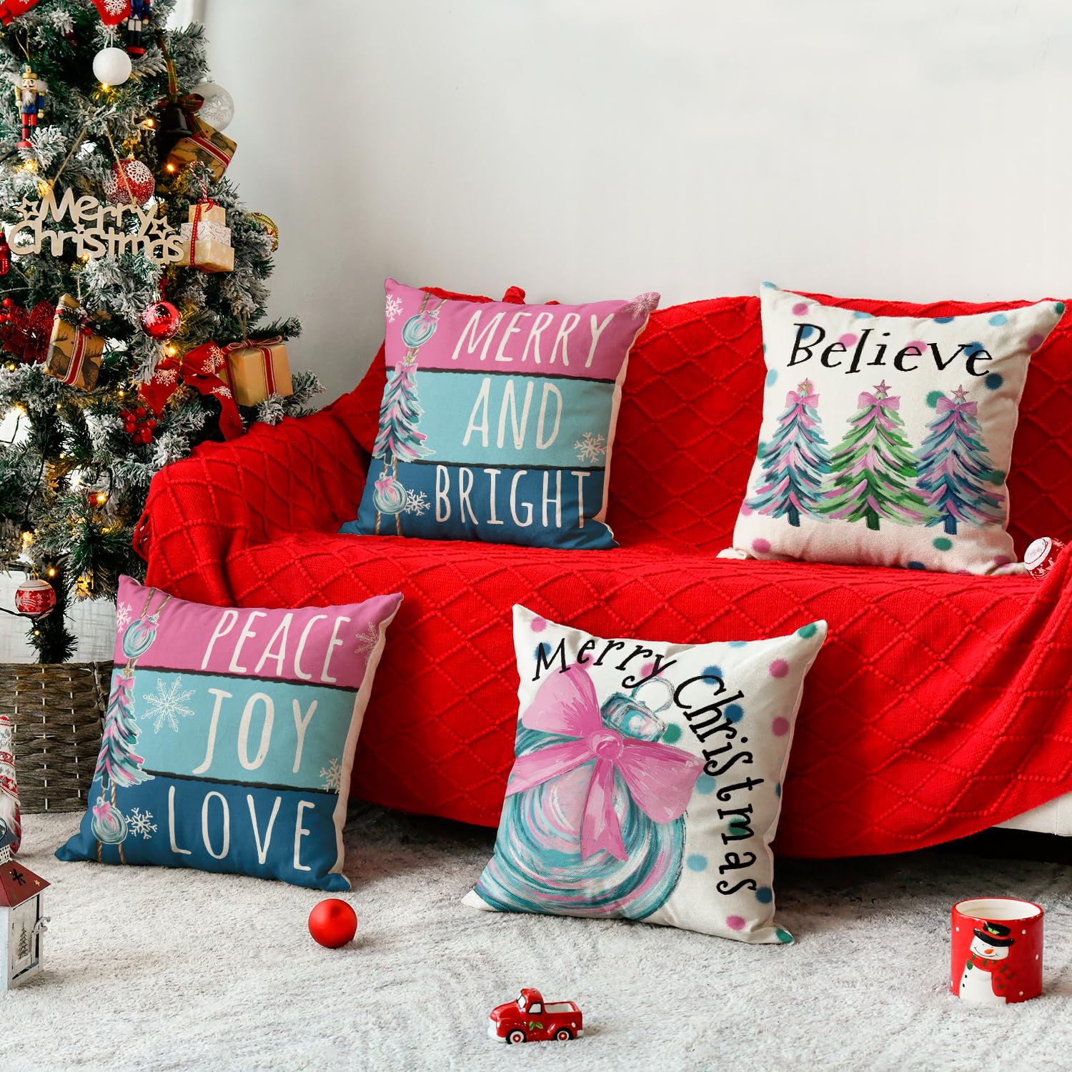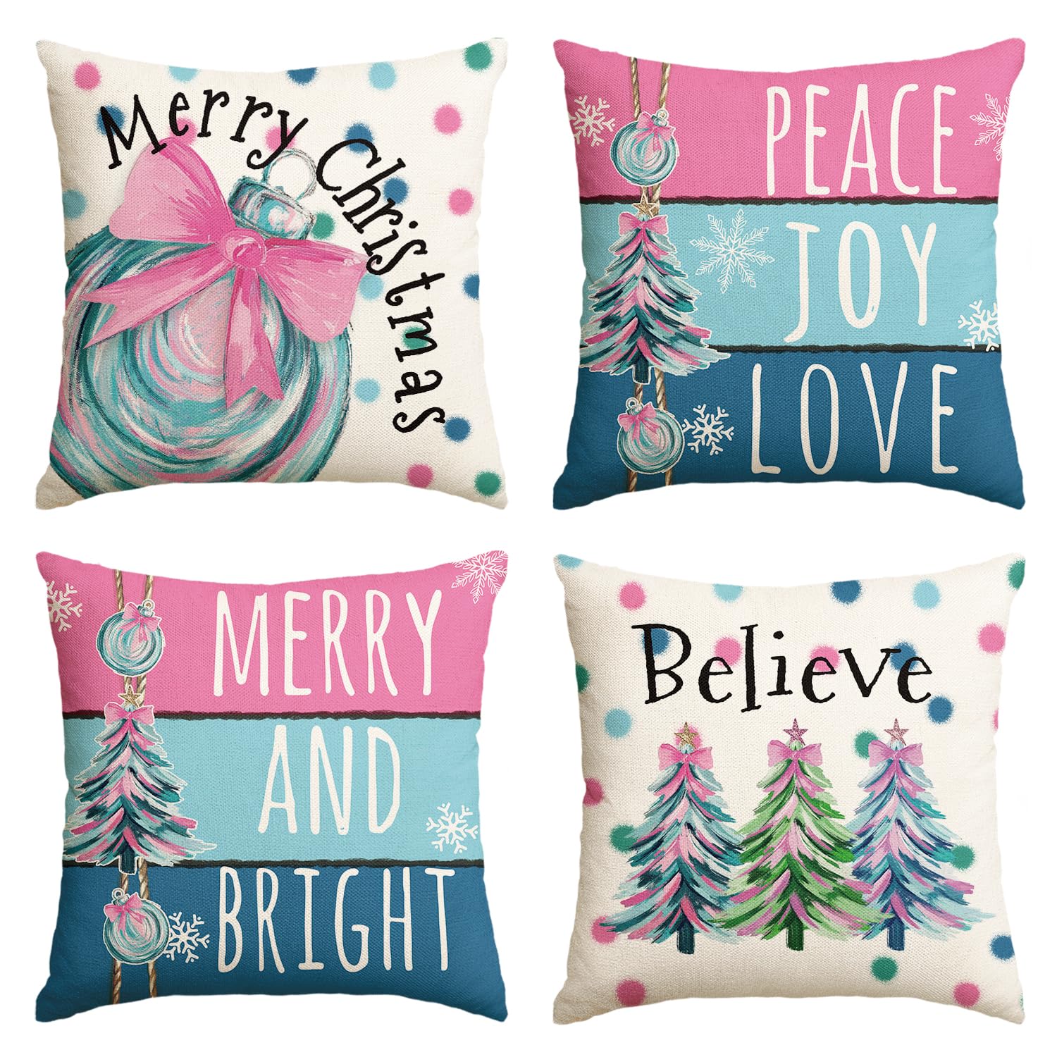 Merry Christmas Trees Balls Peace Joy Love Throw Pillow Covers, 18 x 18 Inch Merry and Bright Believe Pink Blue Seasonal Winter Holiday Cushion Case Decoration for Sofa Couch Set of 4