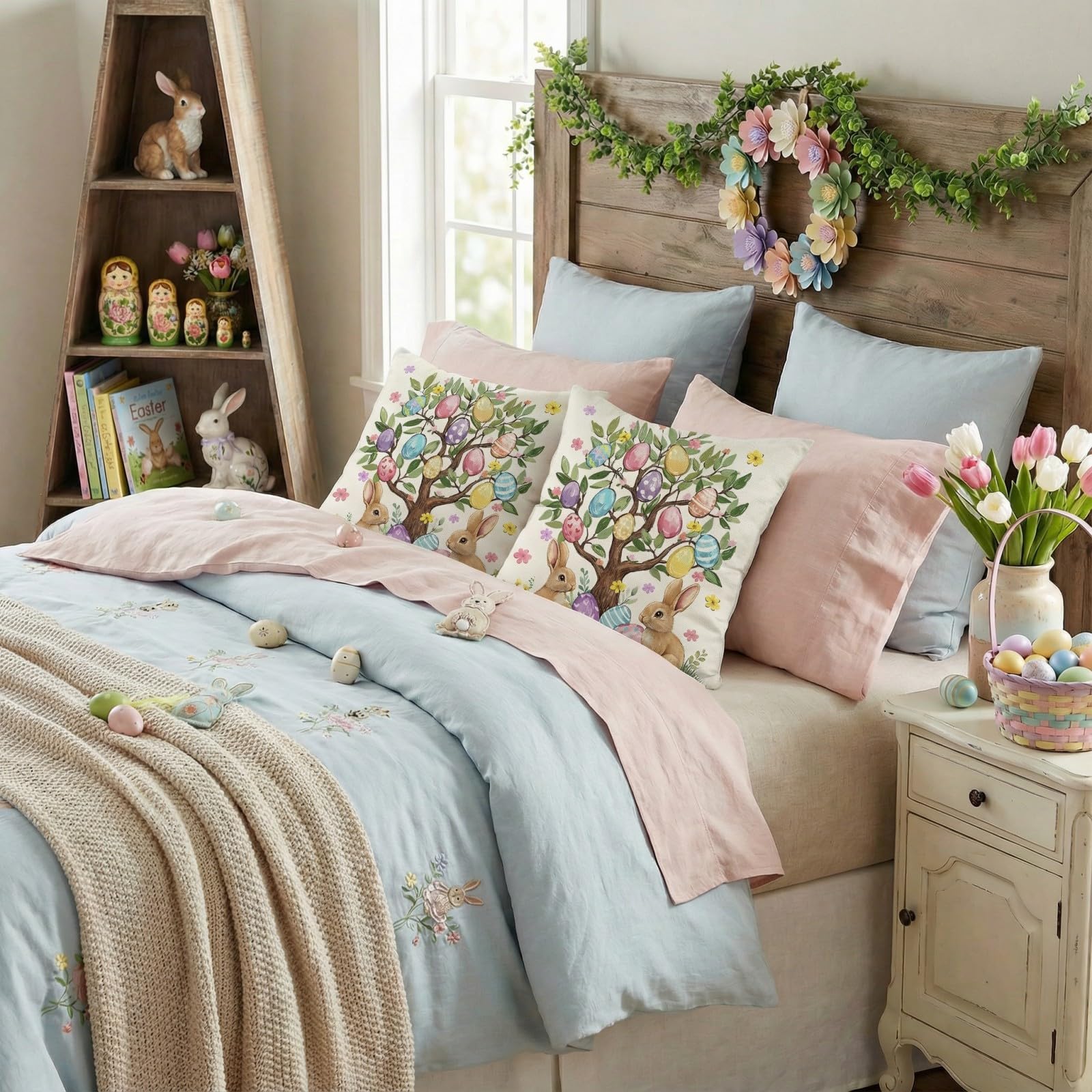 Outdoor Waterproof Easter Egg Trees Pillow Covers Set of 2-18x18 Inch Farmhouse Decor with Bunnys Eggs