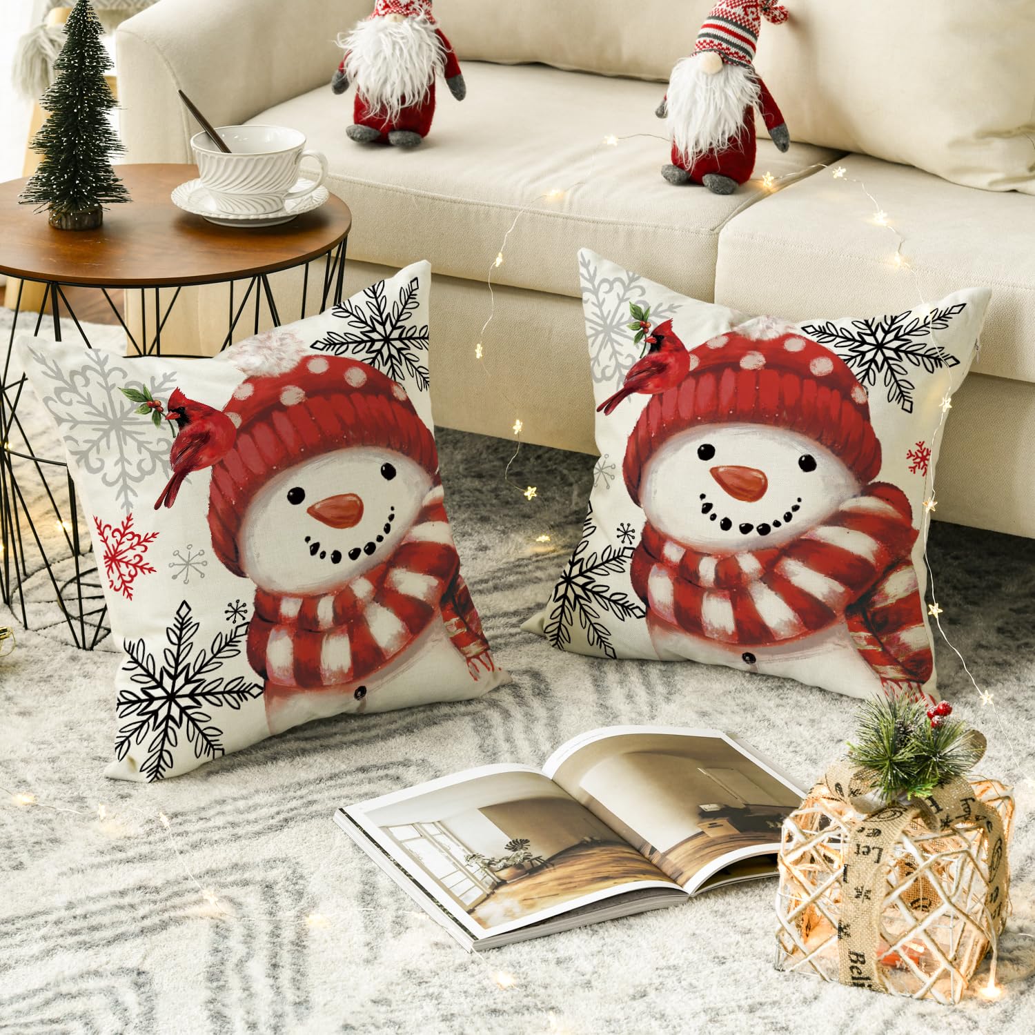 Winter Snowman Snowflake Bird Throw Pillow Covers Set of 2, 18 x 18 Inch Red Seasonal Christmas Holiday Cushion Case Decoration for Sofa Couch