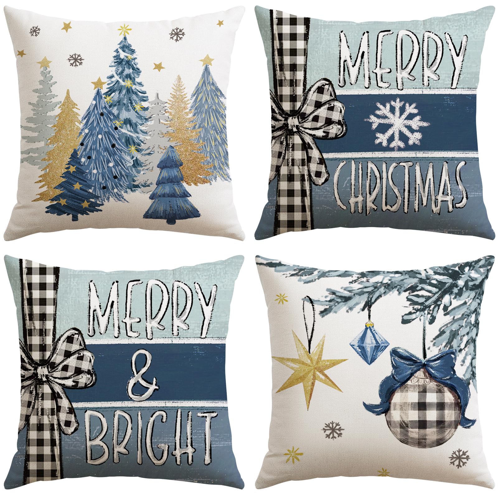 Christmas Throw Pillow Covers 18x18 Inch Set of 4, Merry Christmas Bright Xmas Tree Ball Winter Decoration Pillow Cases for Home Sofa Couch Decor-Blue