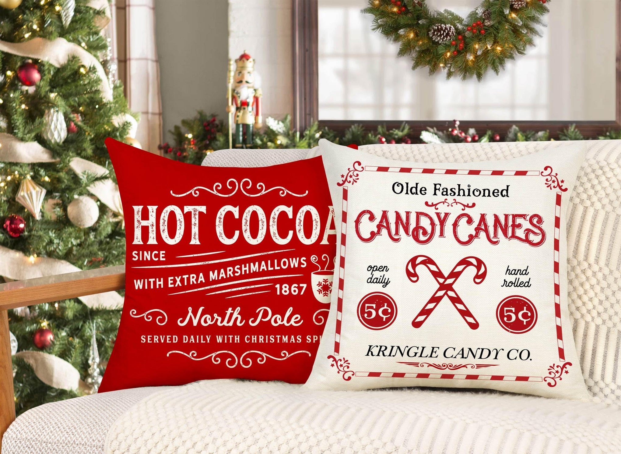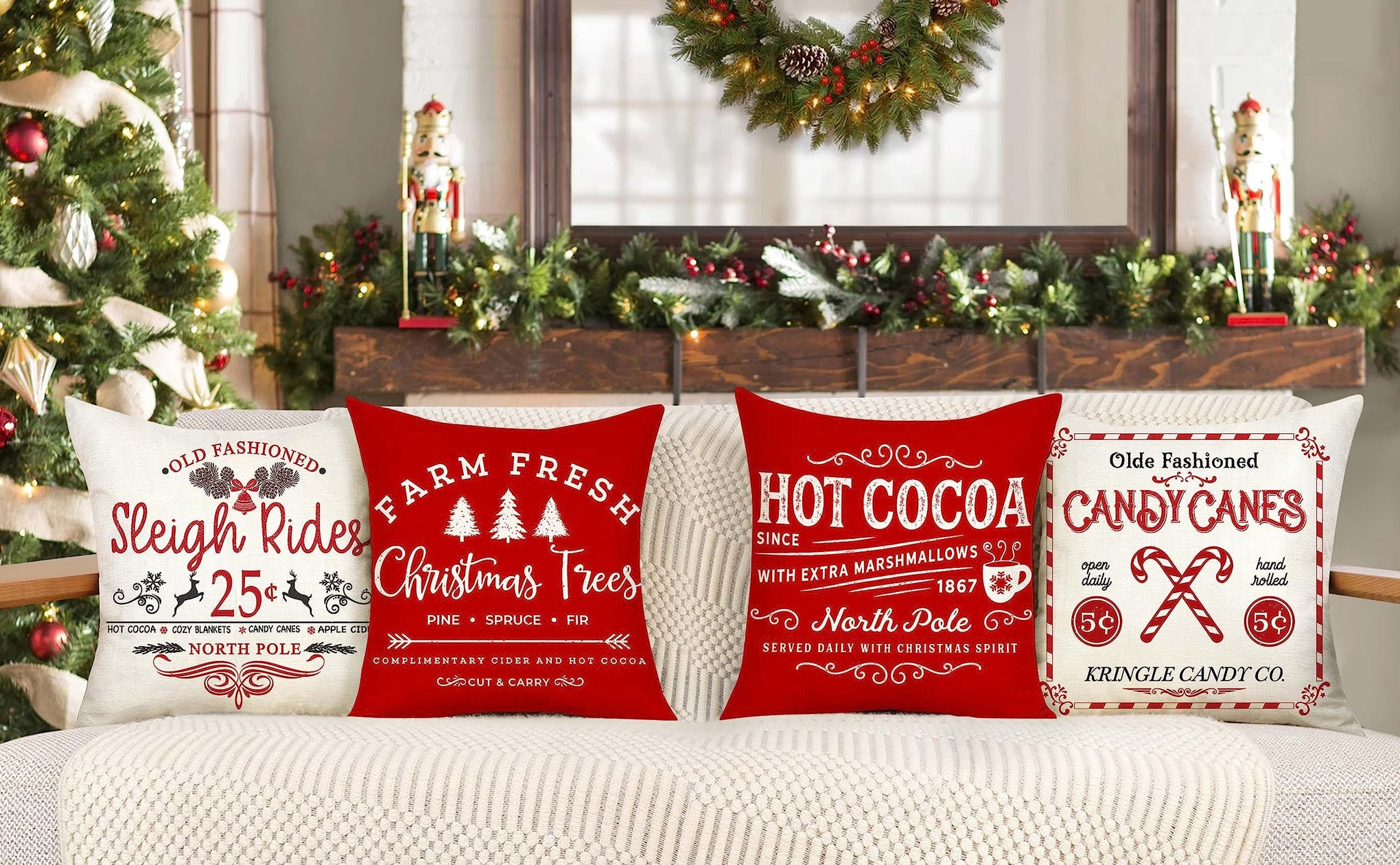 Farmhouse Christmas Pillow Covers 18x18 Set of 4 Winter Holiday Decorations Xmas Red White Rustic Throw Cushion Case for Sofa Couch Home Decor (Sleigh Rides, Farm Fresh Tree, Cocoa, Candy Canes)
