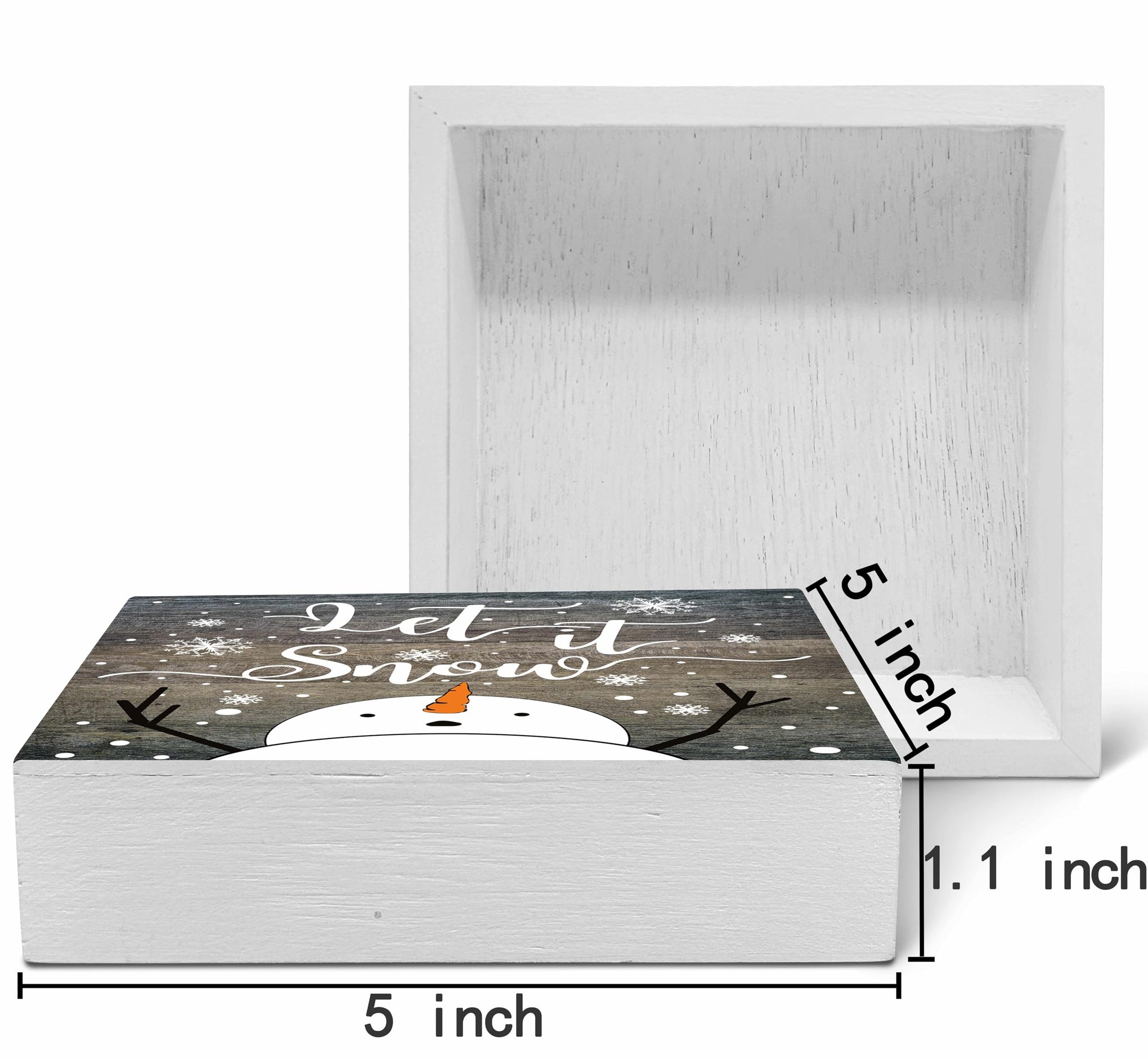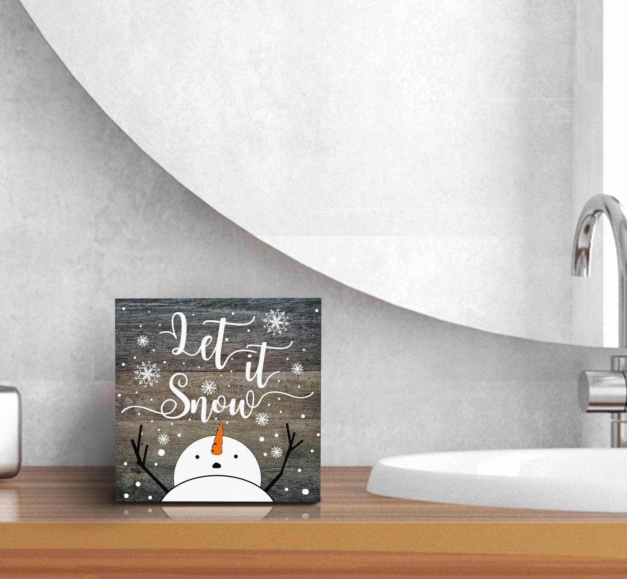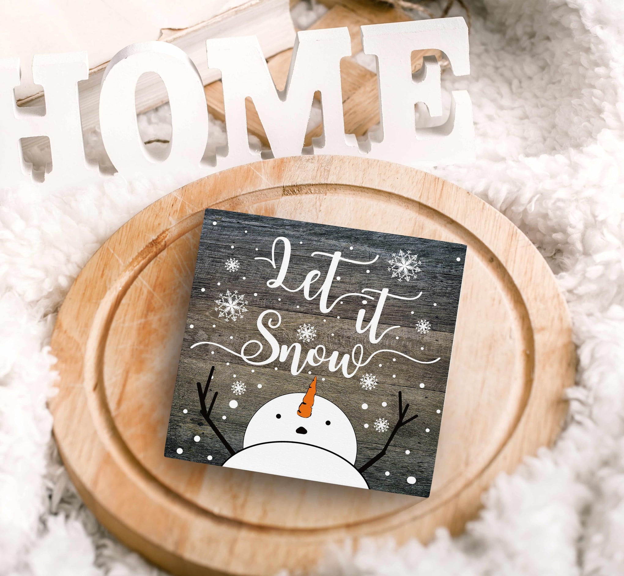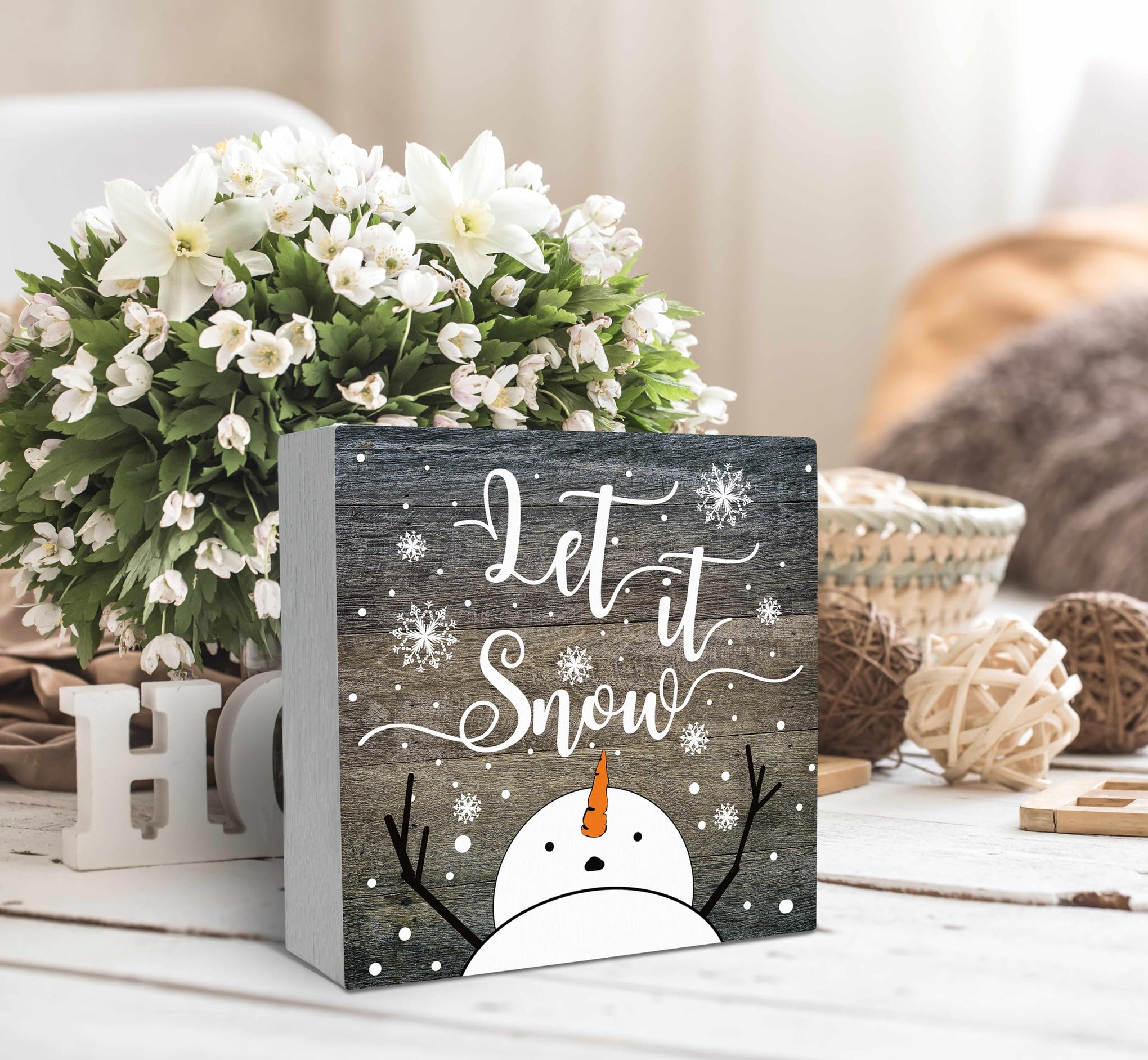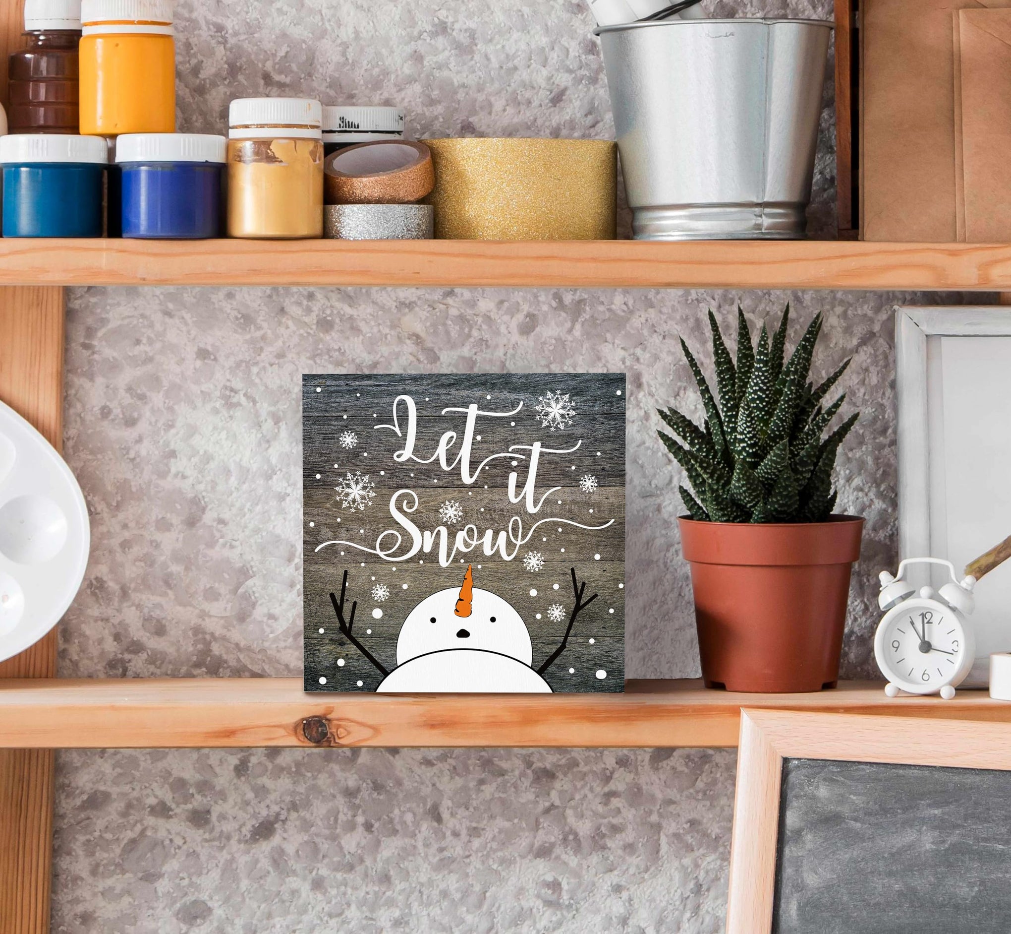 Let It Snow Christmas Wooden Sign Desk Decor, Snowman Christmas Decor, Rustic Winter Snowflake Wood Block Signs for Home Office Xmas Party Holiday Desk Table Shelf Decorations, 5x5 Inches