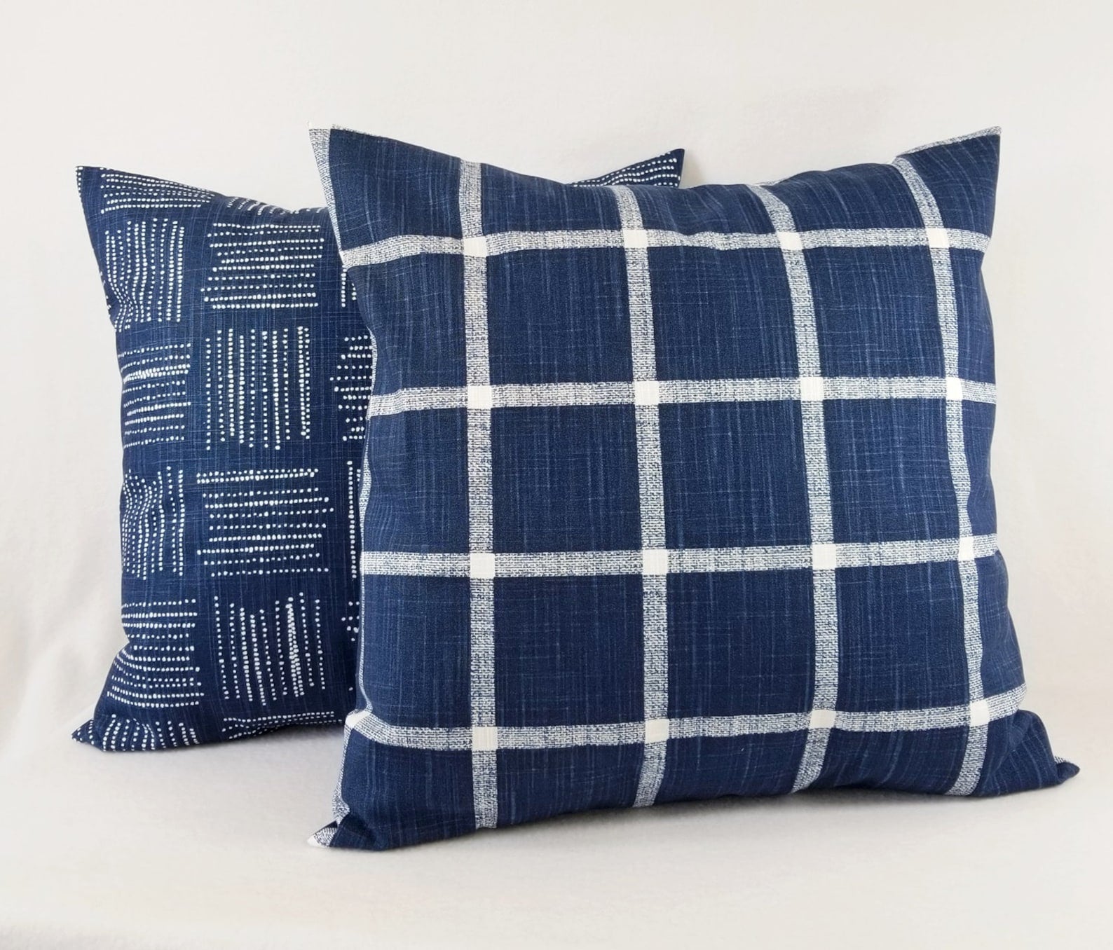 2 Pack Dark Blue Pillow Cover, Mid Century Blue Tie-Dye Watercolor Pillow Sham, Buffalo Plaid & Geometric Stripes