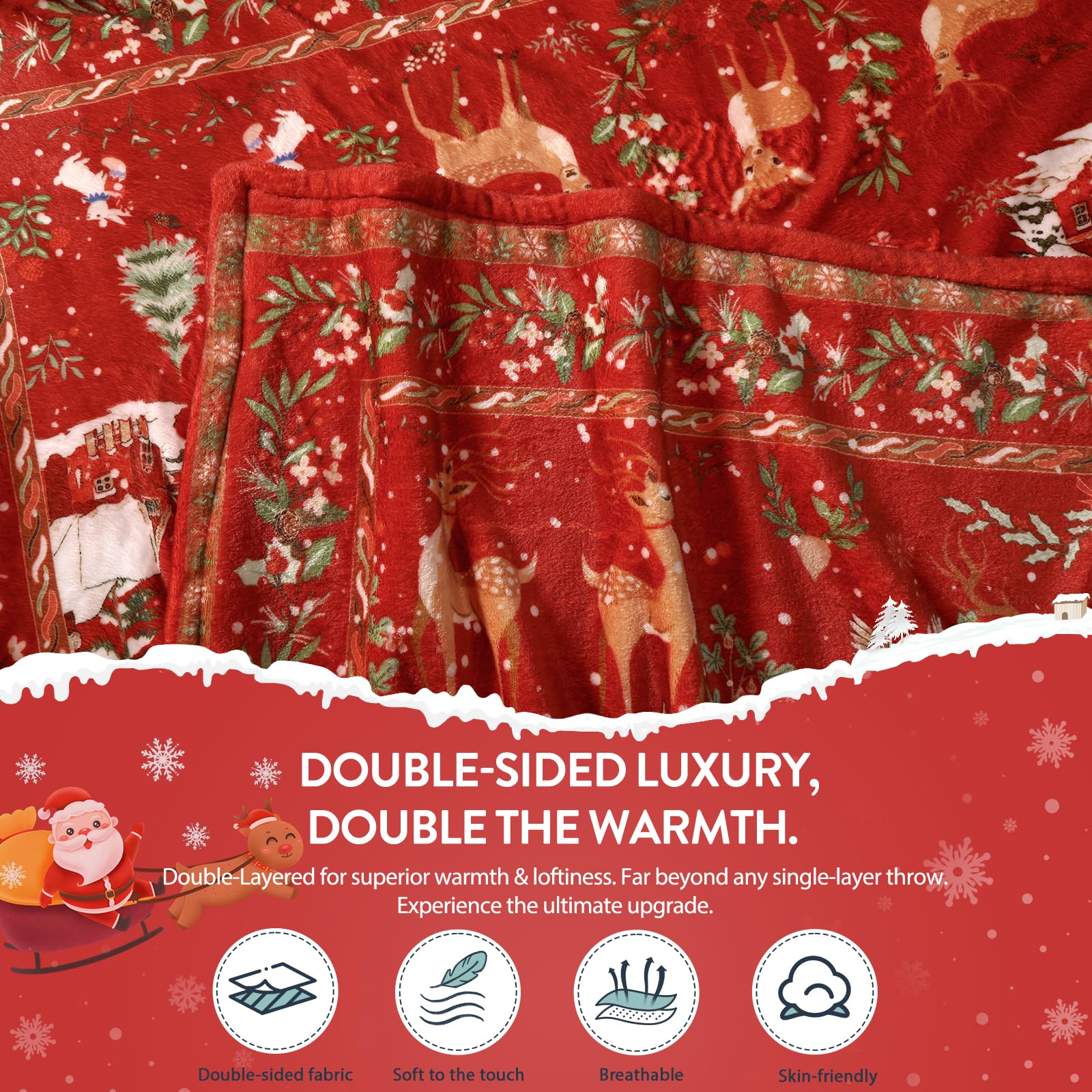 Christmas Blanket 50x60 Reversible Fluffy Fleece Holiday Blanket Xmas Deer Throw Blanket for Couch Bed Living Room, Christmas Reindeer Red