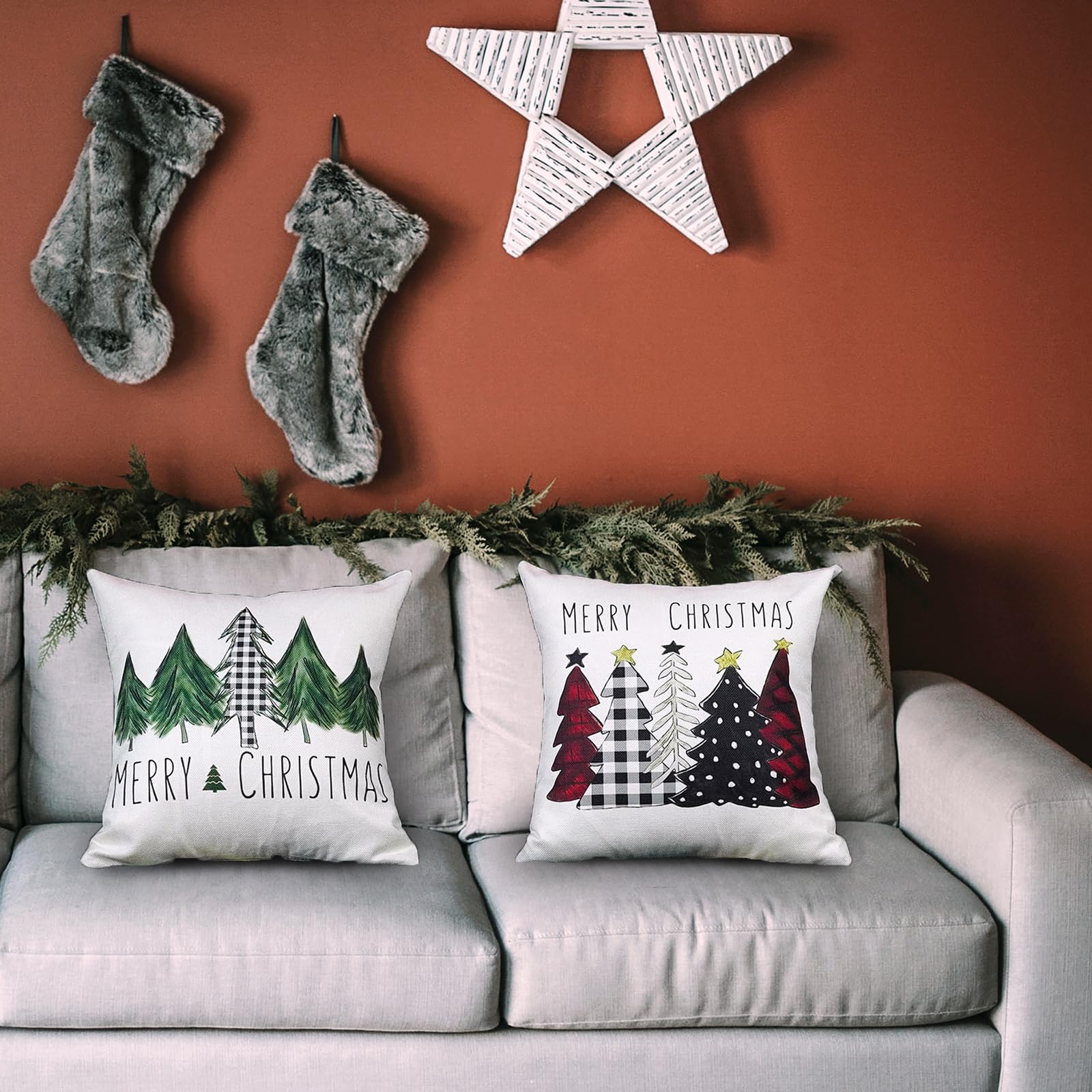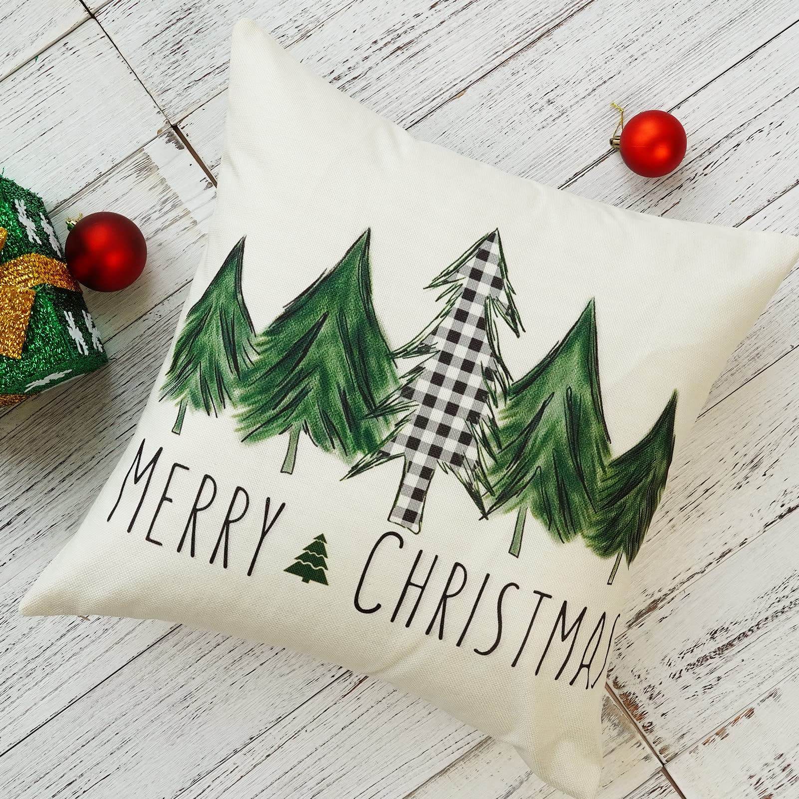 Christmas Pillow Covers 18x18 Inch Set of 2 Xmas Trees Red Buffalo Plaid Black Green Decorative Pillowcases